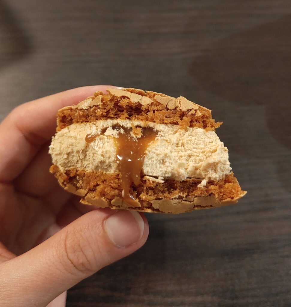 アイスがとてもおいしい!マカロン部分は結構砂糖の甘さ強め、甘党の私でももう少し甘さ控えてもいいかもと思いました。