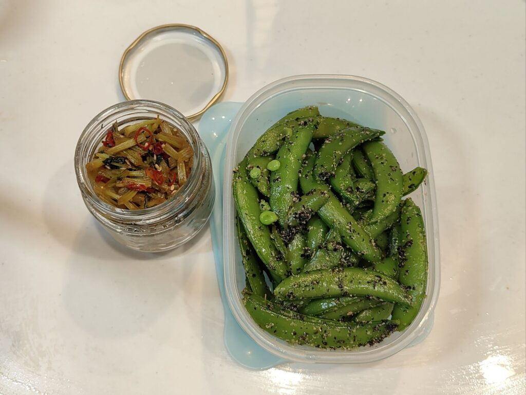 スナップエンドウを茹でて水切りして、砂糖と醤油と黒すりごまを合わせるだけの簡単副菜。