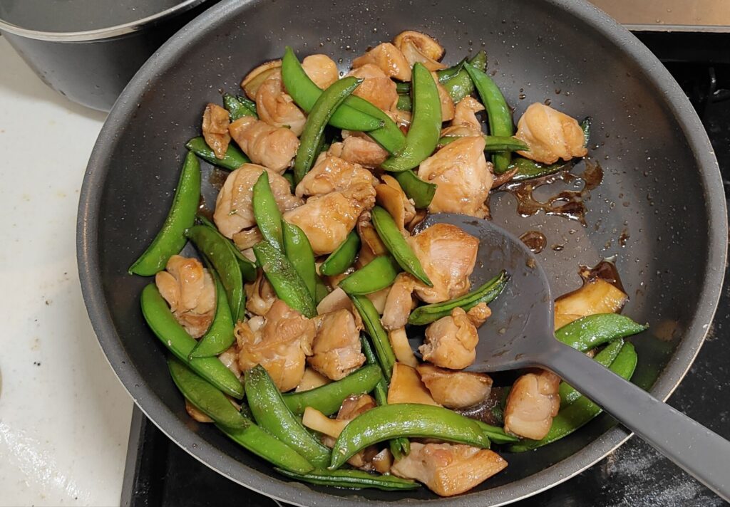 鶏ももに火が通ったらエリンギとスナップエンドウを加えて炒めて。