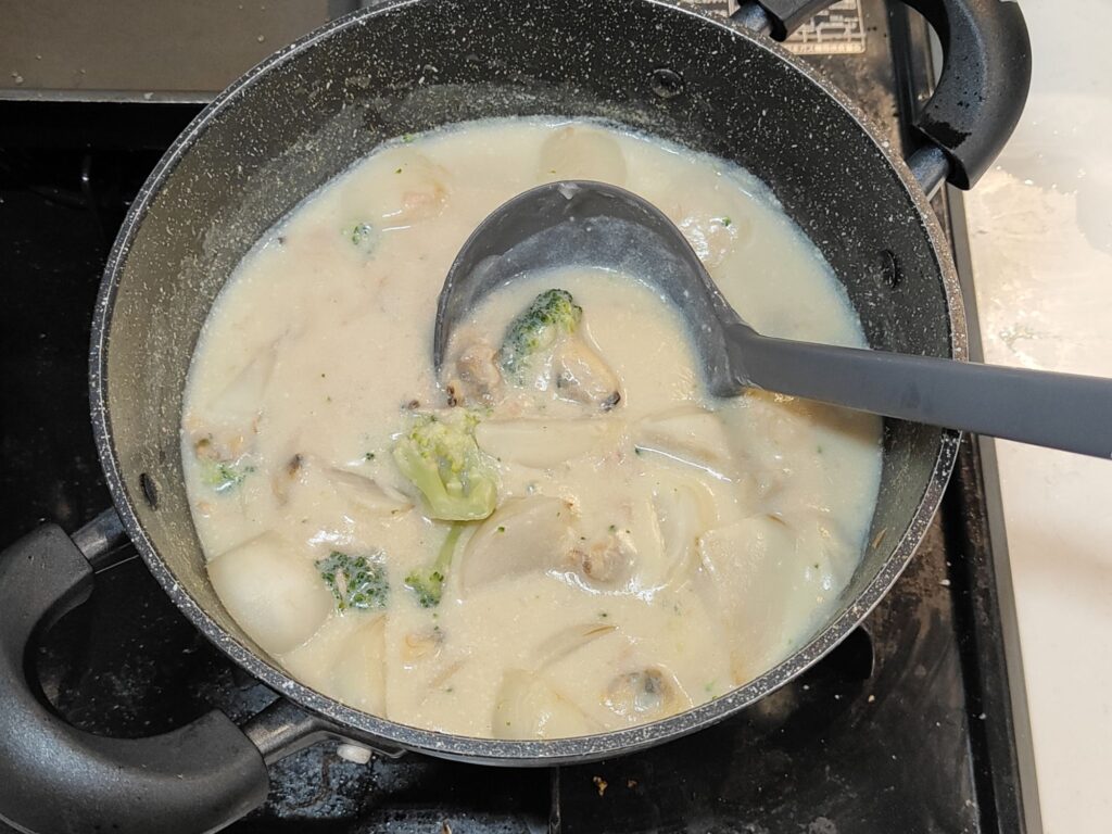 豆乳を入れて少し煮込み、水溶き片栗粉でとろみをつけて完成。